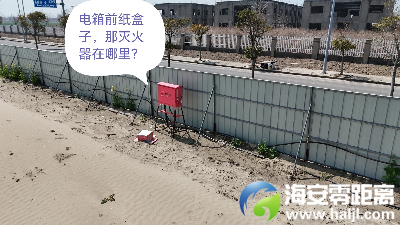问题一、他们说此项目前没有开工,(算是对吧!但还是有少部分人干活)但没开工,安全隐患处于没人管的状态!还有配电箱未正式使用,灭火器已配置。灭火器在哪?我特地今天去看了,也拍了照片,见下面的图!